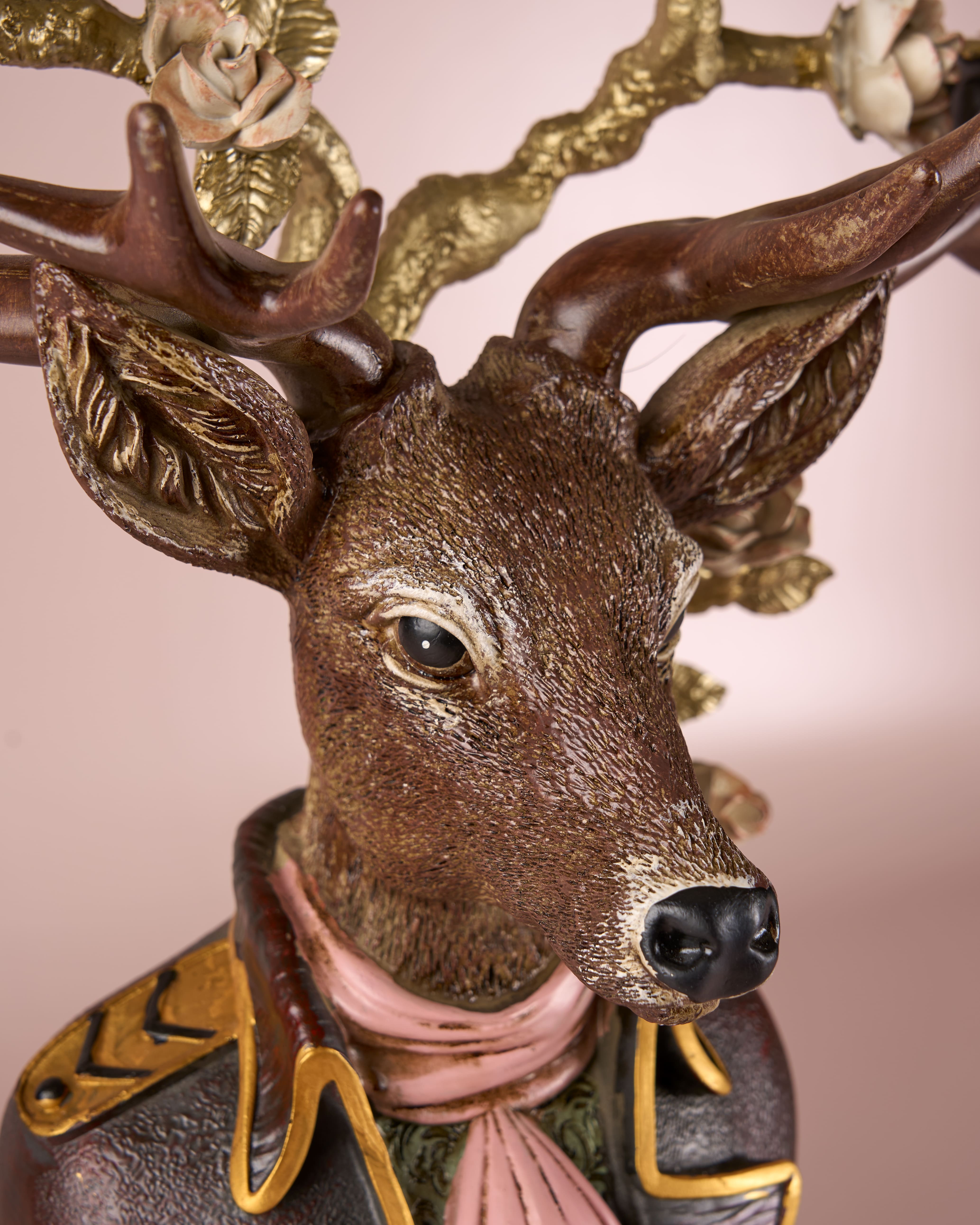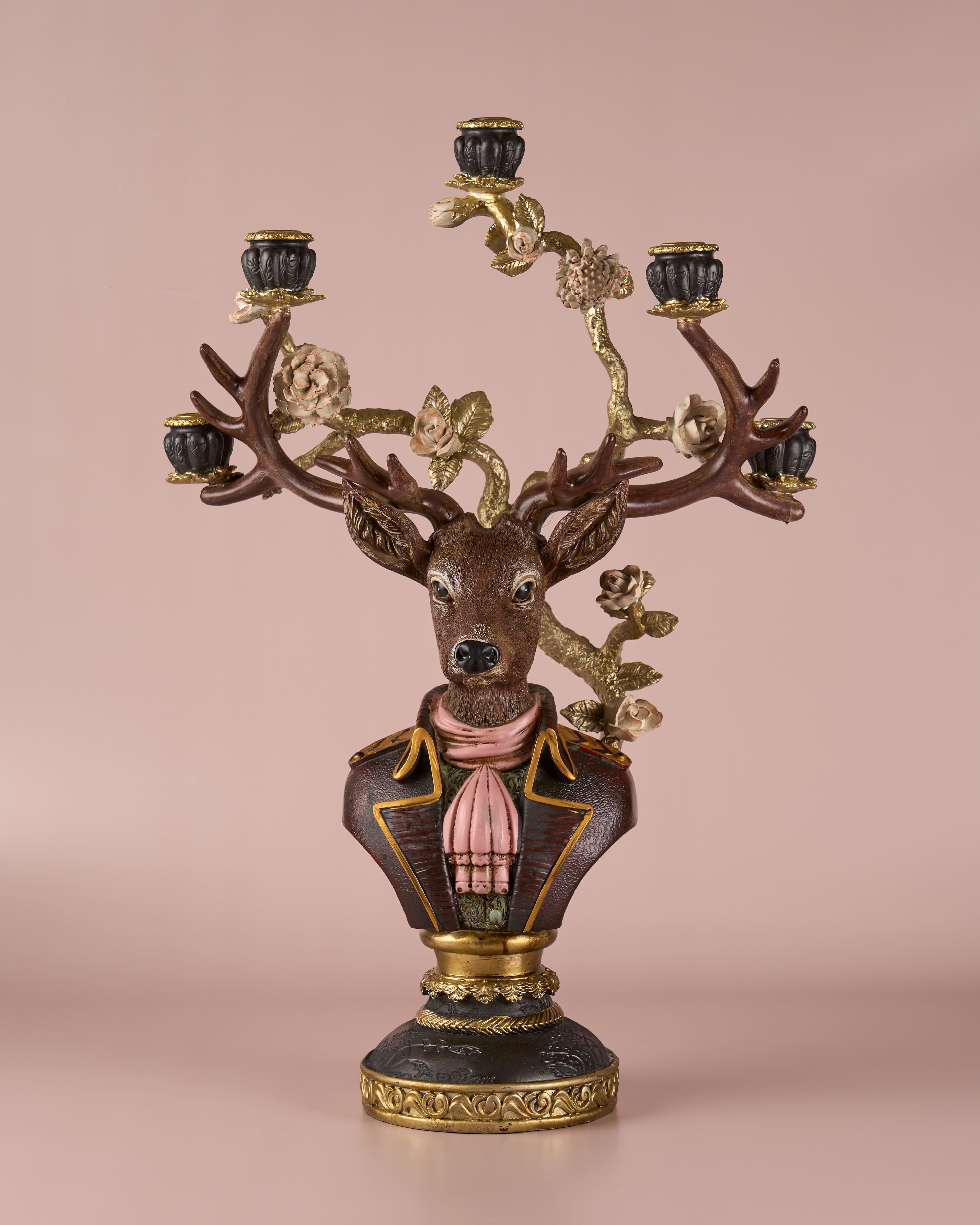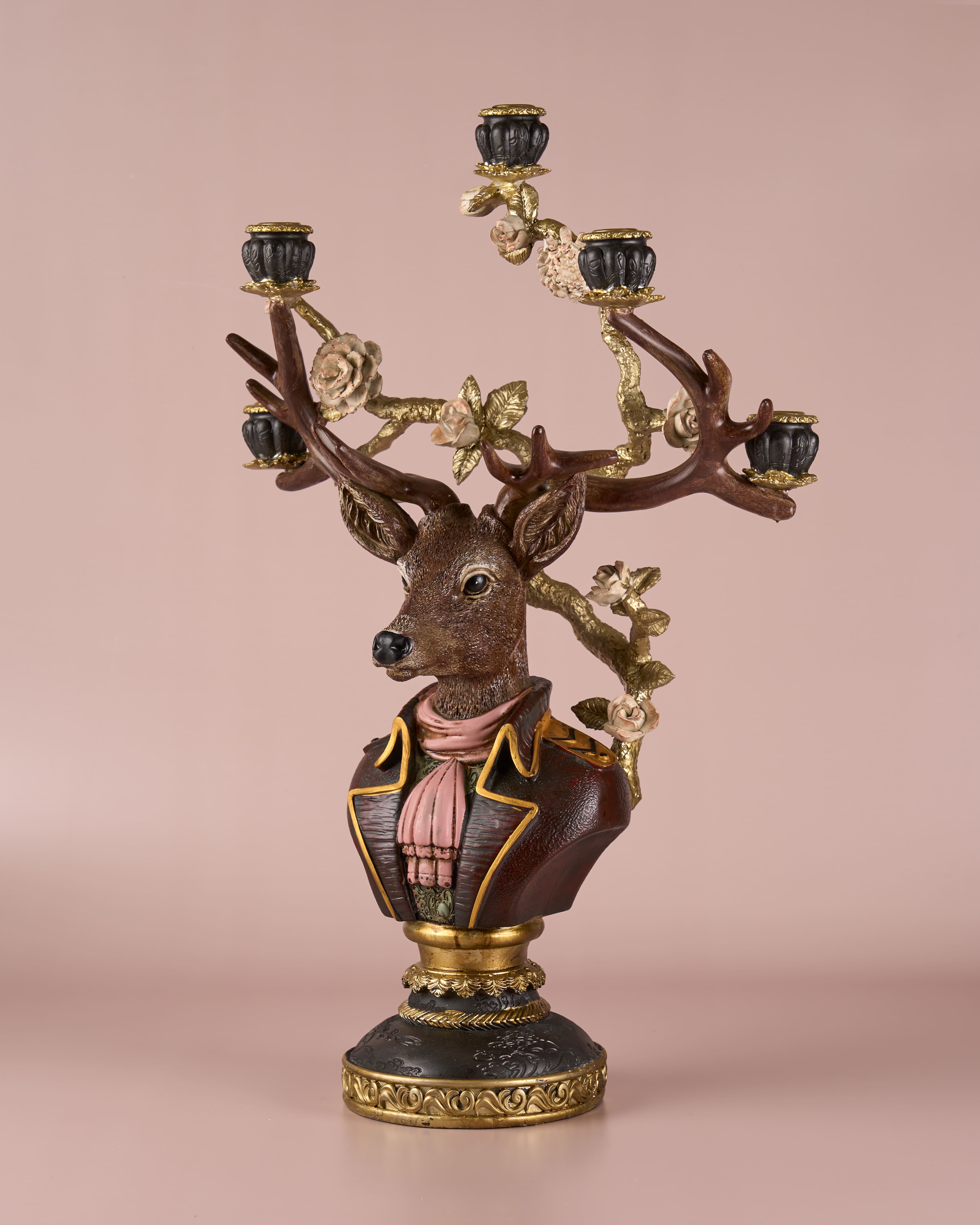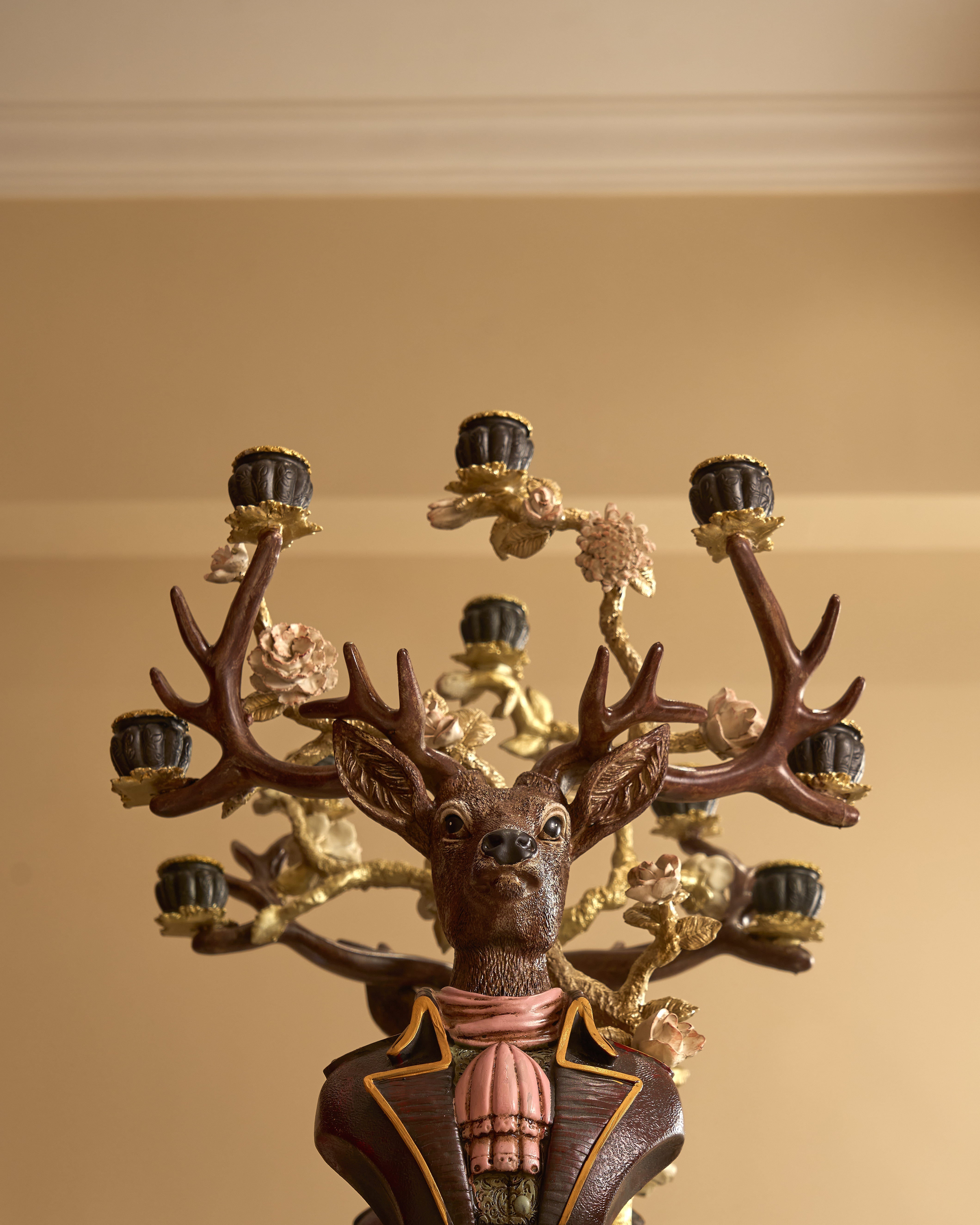 The deer’s antlers serve as multi-armed candelabras, each holding a candle cup intricately accented with floral motifs.