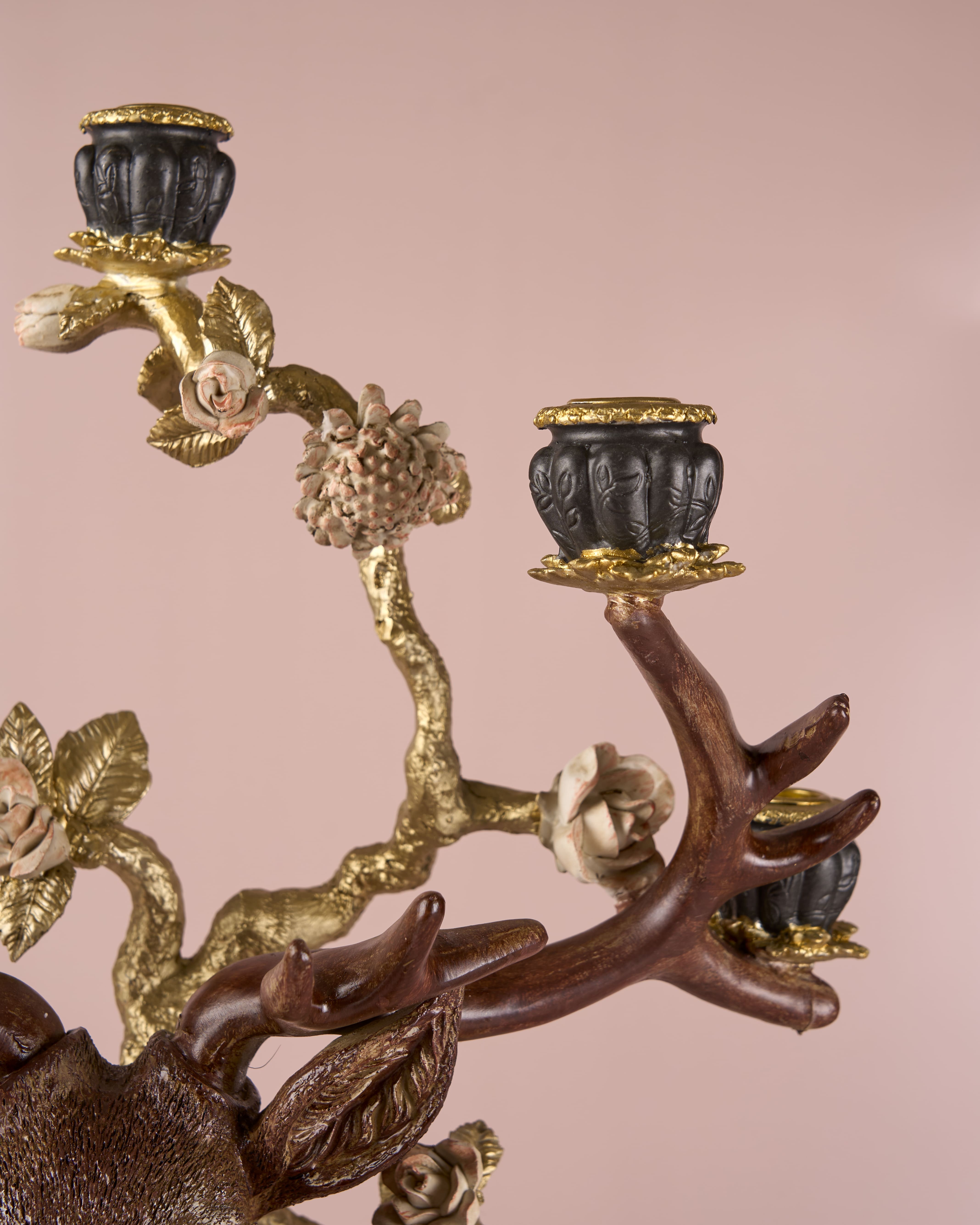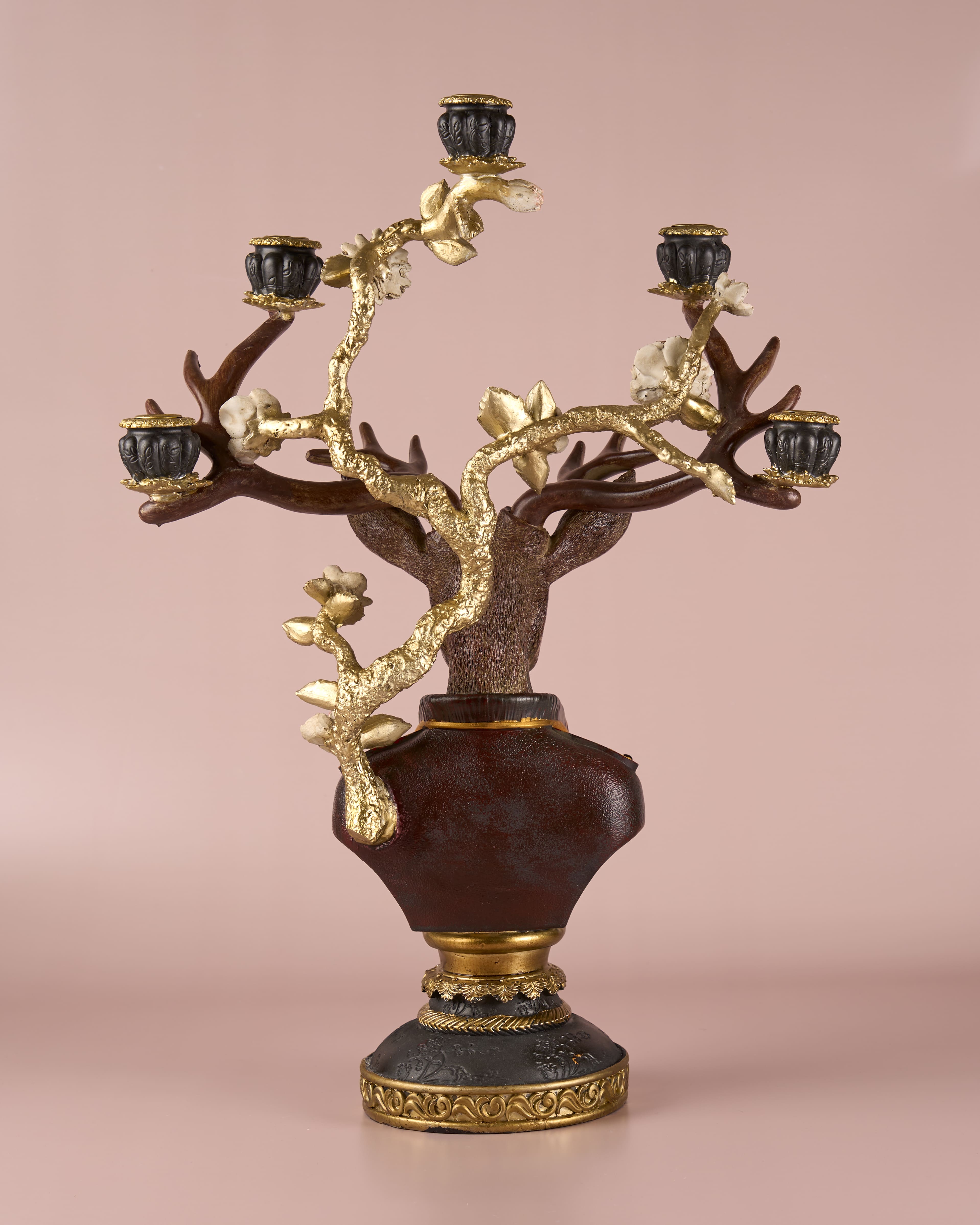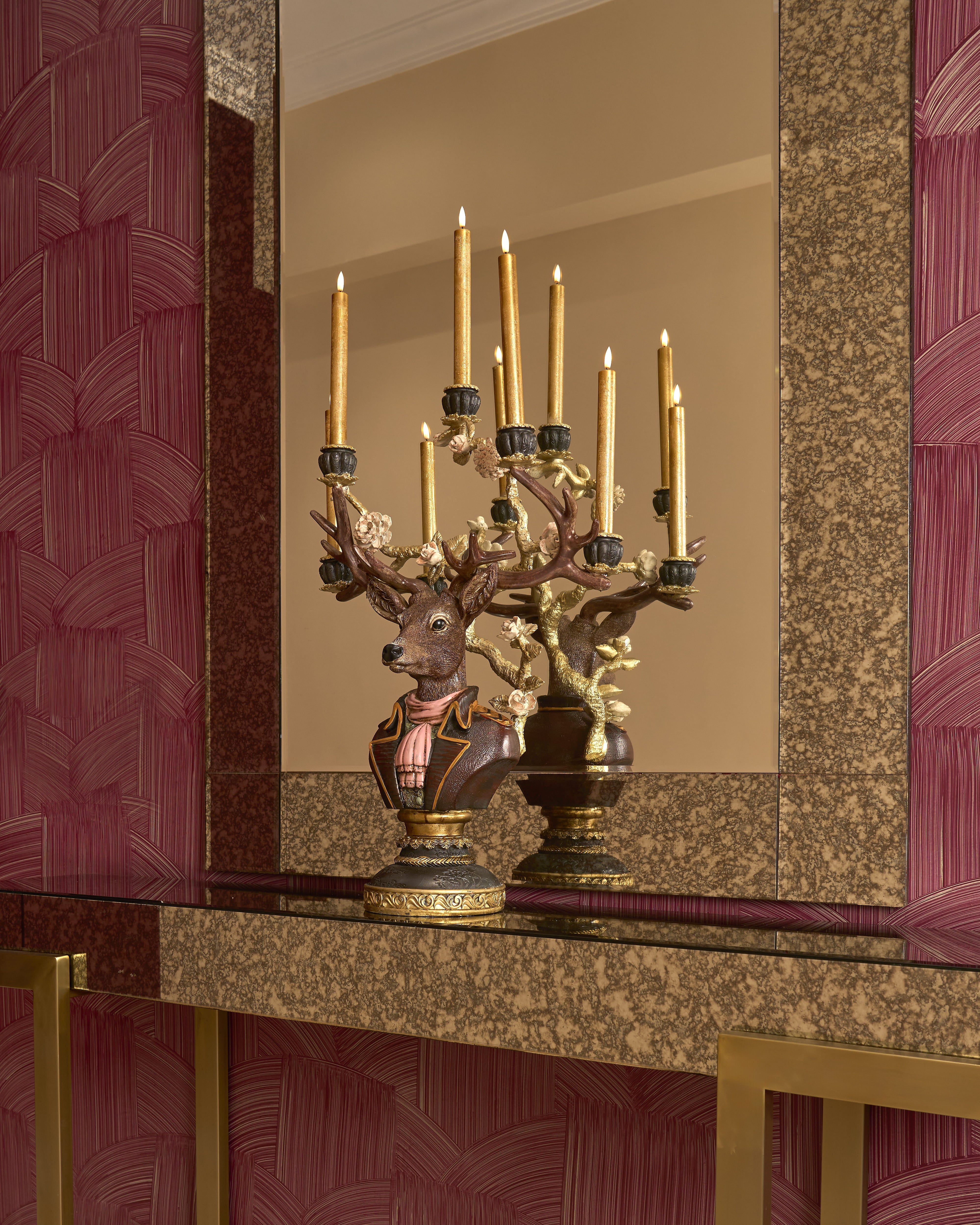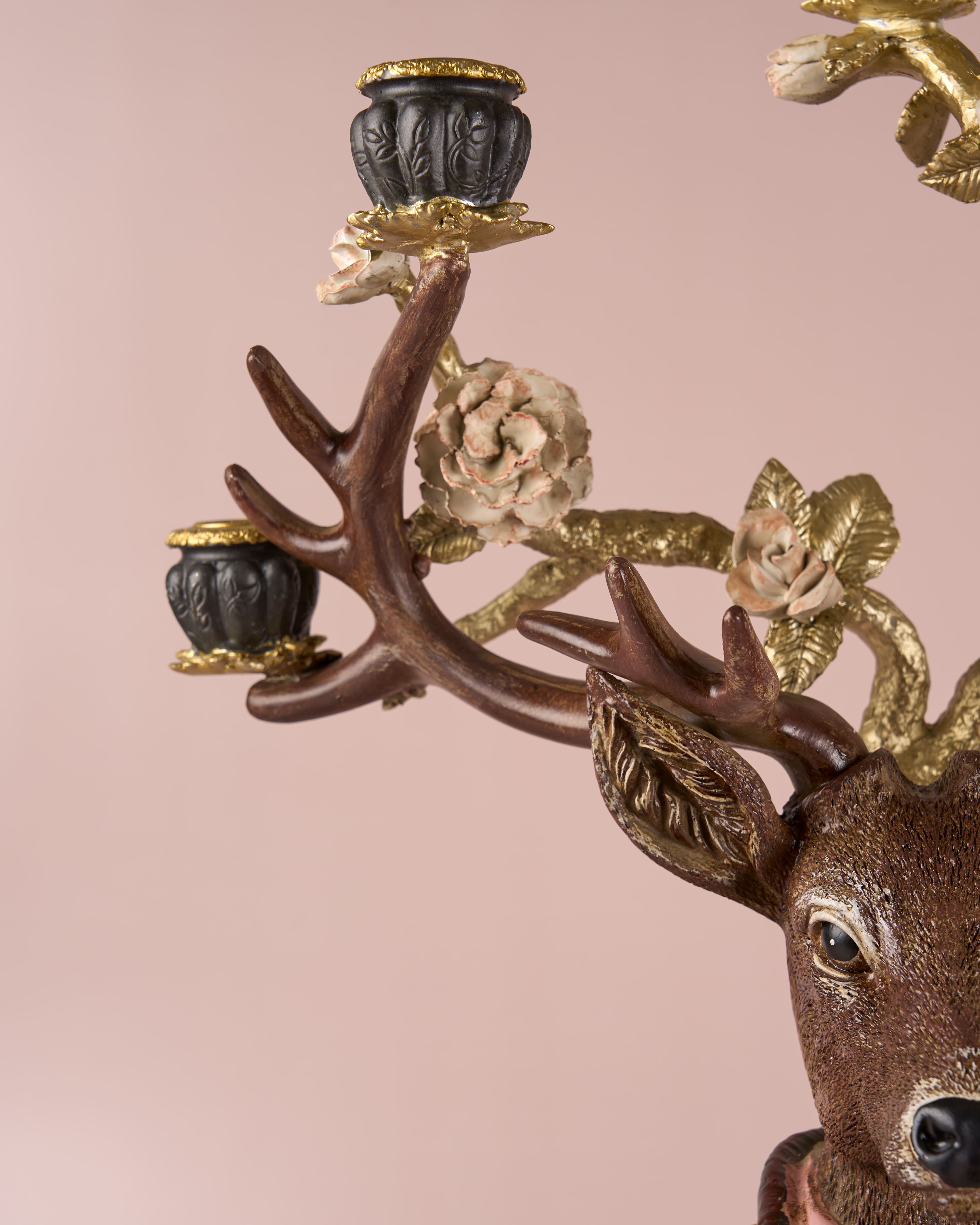 The deer’s antlers serve as multi-armed candelabras, each holding a candle cup intricately accented with floral motifs.